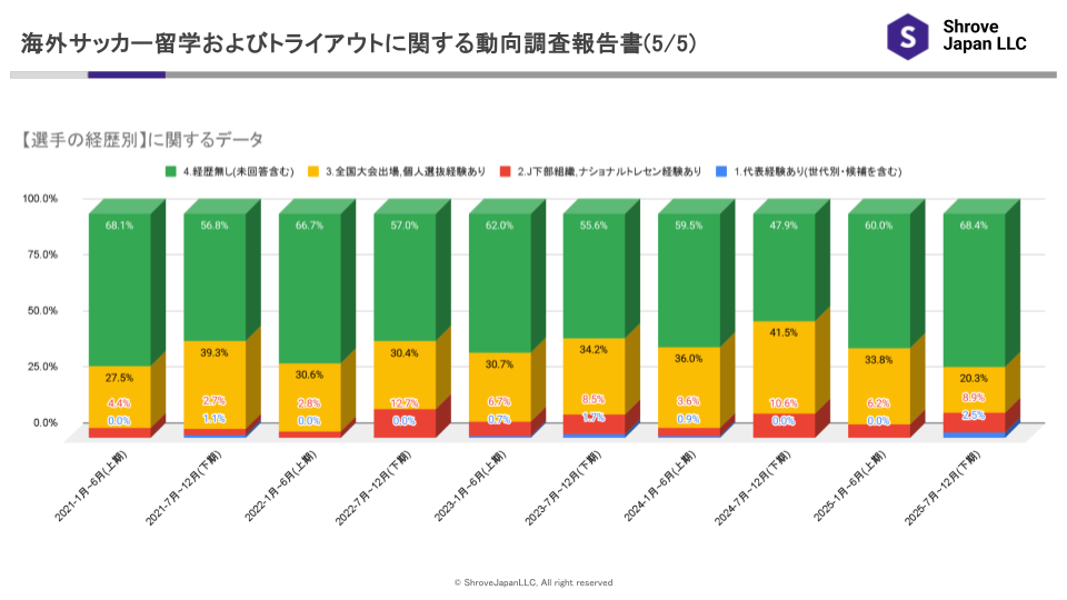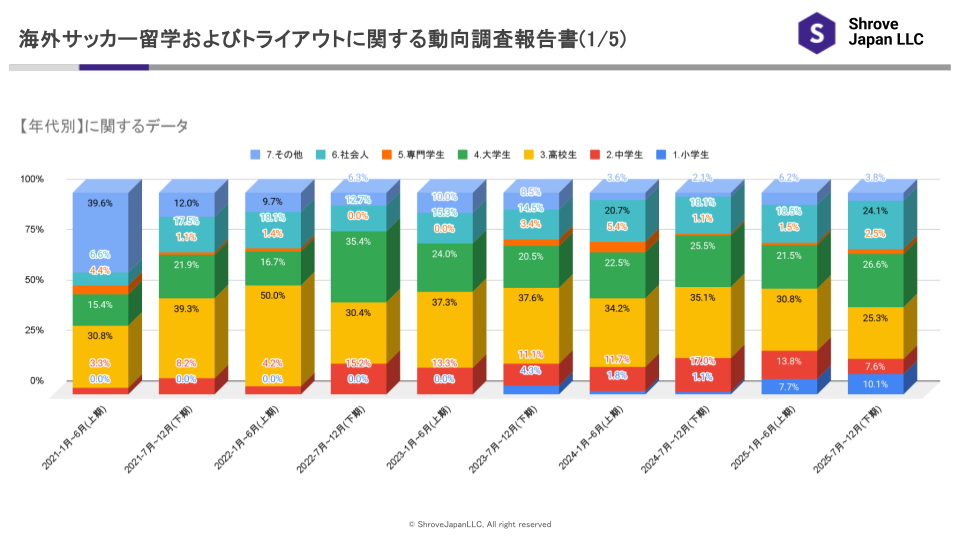 2025年下期における小学生の構成比は10.1%となり、前期(2025年上期・7.7%)から2.4ポイント増加しました。これは集計開始以来初めて10%を超える水準であり、2023年下期の4.3%、2024年下期の1.1%と比較しても、直近1年間で大きく伸長しています。海外サッカー留学・トライアウトの検討が、従来よりも早い段階から行われるケースが増えていることが、数値上から確認できます。