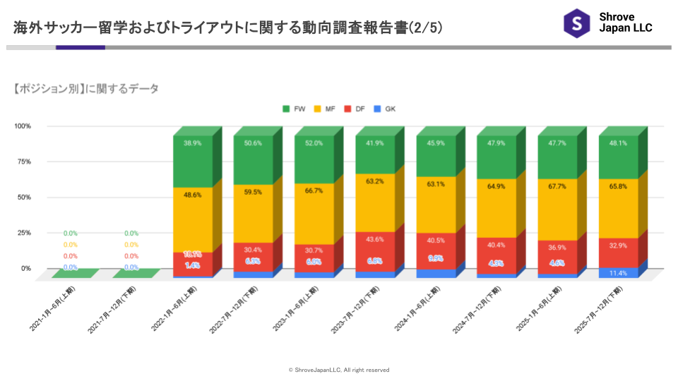 DFの構成比は32.9%となり、前期(36.9%)から4.0ポイント低下しました。一方でGKは11.4%と、前期(4.6%)から大きく増加し、過去最高水準を更新しています。これまでDFが守備系ポジションの大半を占めていましたが、2025年下期ではGKの比率が明確に上昇し、守備系ポジション内の構成に変化が見られる結果となりました。全体に占める割合は依然として攻撃的ポジションが多数を占めるものの、ポジション別の分布には期ごとの変動が現れています。