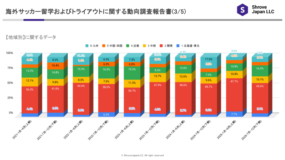 2025年下期における関東在住者の構成比は45.6%となり、前期(2025年上期・47.7%)から2.1ポイント低下しました。ただし、2023年下期以降は一貫して45%前後で推移しており、海外サッカー留学・トライアウト市場における最大のボリュームゾーンである状況に変わりはありません。中長期的に見ても、関東圏が中心である構造は大きく変化していないことが、データから確認できます。