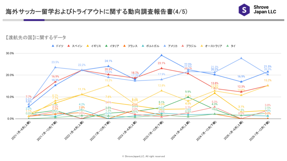 2025年下期における渡航希望先として、アメリカの構成比は20.3%となりました。前期(2025年上期・27.7%)からは7.4ポイント低下したものの、依然として単一国としては最も高い水準を維持しています。2021年以降、アメリカは継続して上位を占めており、期ごとの増減はあるものの、海外サッカー留学・トライアウト市場における主要な検討先である状況に大きな変化は見られません。