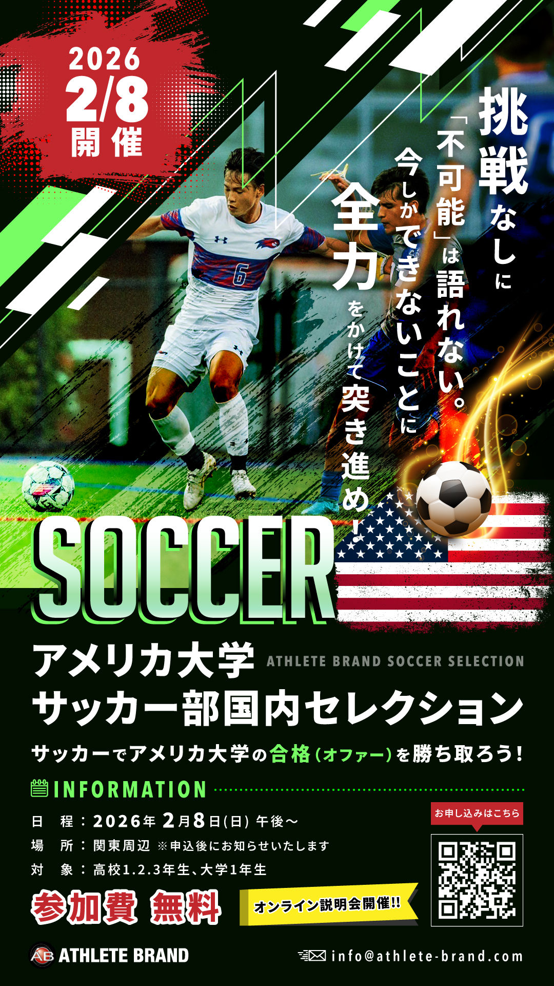 アスリートブランドが、高校1年生~3年生を対象にアメリカ大学サッカー留学国内セレクションを開催します。